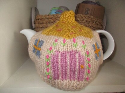 This is a pattern for a Cottage Tea Cosy. It is knitted in a chunky weight yarn, any yarn knitting to the tension can be used. It uses less than a 100 gm ball of the main colour and smaller amounts of the contrast colours. DK yarn is also used for embroidery. It will be fine for beginners able to do simple intarsia and k/p2tog for shaping.