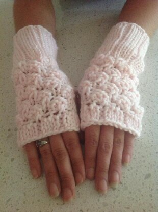 This design features a 10cm (4") ribbed cuff that ties seamlessly into the main pattern stitch used on the top of the hand. The palm is in stockinette stitch with a simple button hole opening for the thumb. One size will fit most as the knitted fabric has a lot of stretch to it.