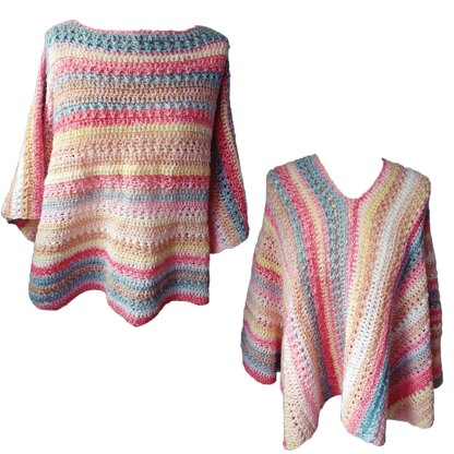 The Cotton Candy crochet poncho is a really easy project. Stylish and fun, this crochet poncho can be worn two ways and will add a pop of colour to your wardrobe. Using double crochet (US terms) and crossed stitches in repeating rows, this pattern works up in no time.