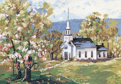Designed by: Nancy Rossi. Stitch this beautiful country church settled in a serene spring meadow. Perhaps a wedding is taking place inside or maybe it’s a place for you to step into to get out of the hustle and bustle of life and contemplate.\n\n