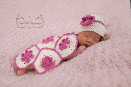 This pattern is for a coverlet and hat set – ideal for photo shoots or as a novelty baby shower gift.