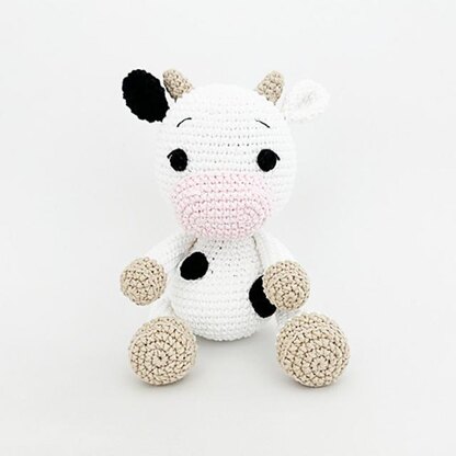 The cow measures approximately 16 cm in a seated position when using the materials mentioned above. If you are using yarn with a different gauge the toy’s measurements will change.