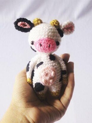 The cow is 10cm tall colors white, black, brown and pink the eyes can be embroidered or with eyes of security is filled with wadding