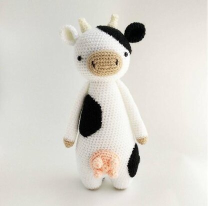 The cow in the picture is made with Stylecraft Special DK yarn on a 2.75 (size C) hook and turned out to be 25 cm tall (about 11.8 inches).