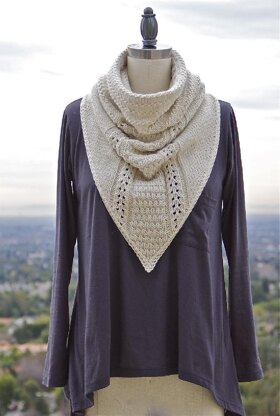 A stylish combination of a cowl combined with a kerchief in a textured stitch pattern that looks much more complex than it really is. This scarf is knitted flat from the top down and fastens in the back with buttons and crocheted button loops. The top edge is self-faced for extra body, and the edges have a slip-stitch garter selvedge so the kerchief will lie nice and flat.