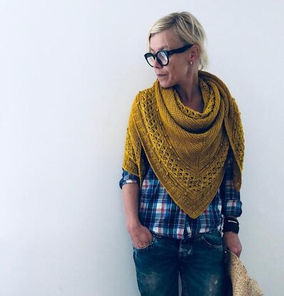 Gauge 15.5 sts x 32 rows = 4 x 4” (10 x 10 cm) in Garter stitch on US 7 (4.5 mm) needles after blocking. 16 sts x 32 rows = 4 x 4” (10 x 10 cm) in Trellis pattern on US 7 (4.5 mm) needles after blocking. Gauge is not crucial for this project but will affect yardage and final size when different.