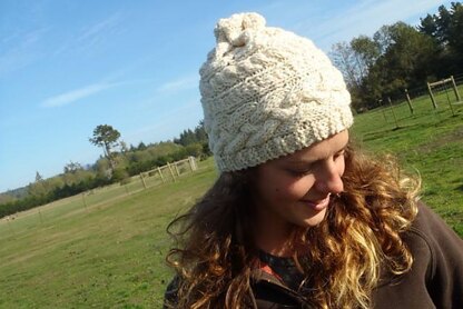 Sizes : One size. Measurements : Width from rim to crown is 8.5”. You can alter the size of the hat by increasing or decreasing the number of rows you knit. Yarn : 1 skein ‘Fleece’ Handspun by Annie Claire [100% Romney wool, 4oz, 200yds]. Needle : US 10.5 [6.5mm], or needle to obtain gauge. Gauge : 15 sts and 20 rows = 4 inches in st st. Notions : Tapestry needle, cable needle.