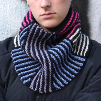 This cowl is an exciting little project - perfect to train short rows the easy way. Due the refined bind off method, the cowl is completely seamless. The pattern can be worked in one colorway or is ideal for use up wasted yarn. The design demands on a playful handling of the geometric forms and colors. I have chosen black as main color and combined it with colored yarns. Try other combinations or materials.