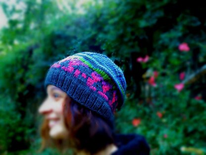 A cozy slouchy hat with a woodland cabin scene, knit in the round with two colors of yarn.
