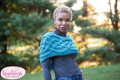 The cowl is knit flat and grafted together at the end. The cable pattern is presented in chart form only.
