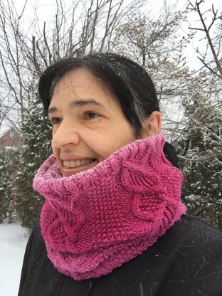 The COZY cowl is knitted in double thickness : a beautiful cable stitch decorates the outside in a beautiful gradient. The inside of the cowl is in stocking stitch in a velvet yarn for its softness on the skin.