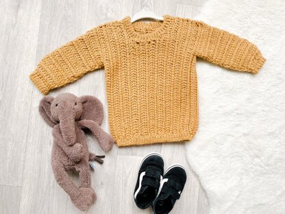 A cozy baby sweater in size 0 - 24 months, using snuggly aran yarn with a ribbed stitch for lots of texture. Made with a few extra inches for a slightly oversized, comfy fit.