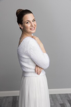 The sweater is easy to knit with this yarn and pattern. It has a V-neck at the back. You can vary and knit it either a boat neckline or with a V-neckline on both sides. The model wears the sweater in ivory, this color is close to white.