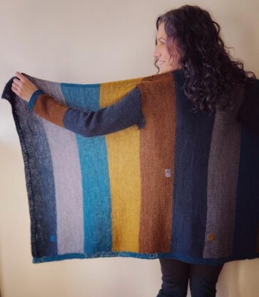 Knit from side to side, you’ll create two openings for sleeves and use short rows to shape the “blanket” part to help it curve around the front and around the back of your neck. Sleeves are worked by picking up stitches from the armholes and using short rows to shape the sleeve caps. Sizing is very flexible—read through the “Choosing a Size” section of the pattern to decide which size you prefer.