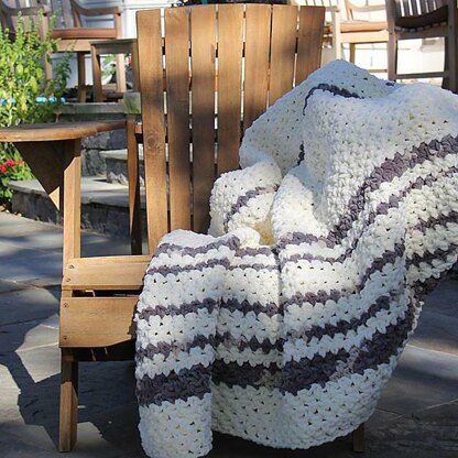 This is a quick, neutral, modern, heirloom quality blanket made with very durable yarn. The blanket features a woven look and a color scheme that go with any home décor and simple stripes. It’s perfect for snuggling up by the fire or as an extra layer during the cooler days outdoors.
