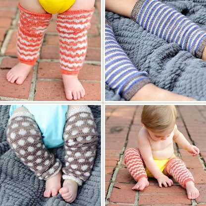 Comfy cozy for outdoors or air conditioning, this legwarmer design offers a selection of trim, colorwork & fit options. Mix and match as you please. The smallest size is intended to fit babies through toddlers as they age, demonstrated on all three models—a 3-month old, a 1-year old and a 3-year old. Two additional sizes are provided if you prefer a roomier or lengthier fit instead of the “grow with me” option. Colorwork is both written & charted.
