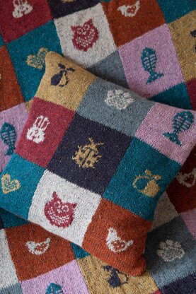 This charming cushion has a knitted front with nine Fairisle motifs in different colours of Felted Tweed DK in squares that are patchworked together with back knitted in stripes of the same yarn.