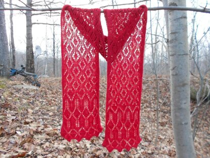 Knit this cheery, Cranberry Sauce Lace Scarf in time for the holidays! It knits up quickly in a lace weight yarn, but can just as easily be knitted with any heavier yarn or any other holiday color, of your choosing. If you use the lace weight yarn suggested, you will find this to be a light and airy scarf, yet warm and cozy. The scarf is worked in halves, from the bottom up, and then joined in the center with the kitchener graft stitch. There are written, as well as charted instructions, for your convenience in ease of knitting the pattern. May your holidays be filled with lots of warm and cozy knitting! Happy Knitting!