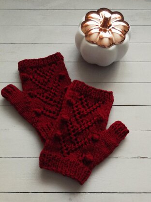These fun little mittens are knit in the round on long circular needles, although you can use whatever method you prefer. The double start cast on is used to make a stretchy cuff that will still fit snug around your wrist. The ribbing used in the pattern makes for a super squishy fabric that feels lovely on your hand. The lace pattern is very easy to memorize and the bobbles are fun to knit. These mittens are sure to work up in no time and use only 100 yards (92 meters) of DK weight yarn making them a great stash buster.