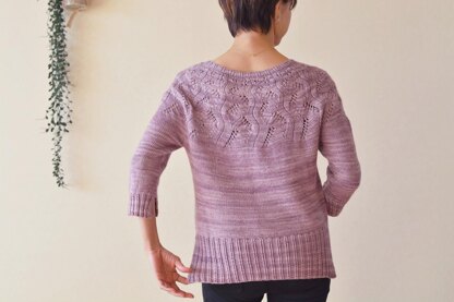”Crawling Vines” is a circular yoke pullover with a gradually growing crawling vines pattern, a hi-lo hem with side slits. You can choose the sleeve length from two options – 3/4 or long. It is worked from the top down seamlessly. The yoke is worked in the round with Crawling Vines pattern, and short rows are worked to make the back longer than the front. The lower body is knit in one piece in the round. Sleeves stitches, set aside at the underarm, are worked down in the round to 3/4 or full length.