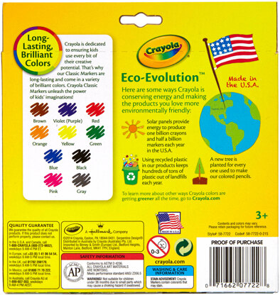 CRAYOLA-Broad Line Markers available in brown, purple, red, orange, yellow, green, blue, black, grey and pink. These 10 classic colors in a broad line marker are perfect for drawing thick lines and coloring large areas. Non-toxic. Conforms to ASTM D 4236. Made in USA.