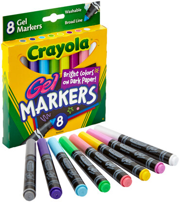 CRAYOLA-Gel Washable Markers in 8 colors. Create cool effects on black, dark and white paper! Great colors for drawing and doodling! You can also use washable GEL markers on glossy paper, poster boards, wrapping paper and more! These washable markers are formulated to easily wash from skin and most children's clothing. Non-toxic. Conforms to ASTM D4236. Made in USA.