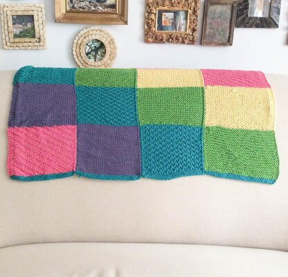 Experiment with stitches and color while creating this vibrant baby blanket! This blanket is knit in strips, making it a great portable project. The construction allows you to create a multicolor blanket while using just one color in each row for a bright and fun patchwork babyghan.