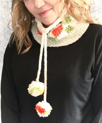 A fun and flirty convertible cowl hat combination with pops of bright color on. a neutral background. This cowl converts to a hat with a simple cord adorned with pom poms.
