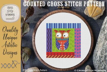 A wonderful Crazy Patch Owl counted cross stitch design.\nGreat stitched individually or partnered with the other 11 Crazy Patch Owls!\nExclusive licensed artwork by Clipartopolis.\nCross Stitch by Marcia Manning.\nDesign is 66 x 66 stitches in size.\nPDF is a COLOR counted cross stitch chart which lists suggested DMC floss colors, and includes a color picture.\nStitched design size is as follows:\nSize 11 count: 6.00 x 6.00 inches or 15.24 x 15.24 cm\nSize 14 count: 4.71 x 4.71 inches or 11.97 x 11.97 cm\nSize 16 count: 4.13 x 4.13 inches or 10.48 x 10.48 cm\nSize 18 count: 3.67 x 3.67 inches or 9.31 x 9.31 cm\nSize 22 count: 3.00 x 3.00 inches or 7.62 x 7.62 cm