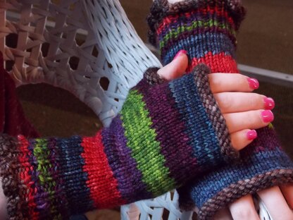 The mitts in the picture are made from yarns from Jorstad Creek Yarns. We also recommend Malabrigo Rios and Cascade Aran. Or use scraps of worsted weight and aran weight yarn from your stash!