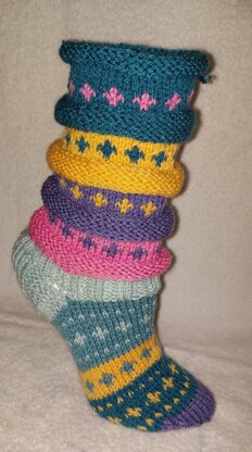 This sock pattern could be your perfect stash buster. Pattern is in 3 sizes, knit with ripple pattern top-down, some colour-work, and heel-flap construction.