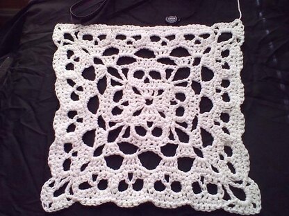 I call this square an infinity square because there is no limit as to how large you can to make it. Use any size thread or yarn. Infinite possibilities with this square. There are pictures of almost every step. Made with a J hook and aran weight my square measured 8 inches after I completed the first round of skulls. 16 inches after the second round was added.