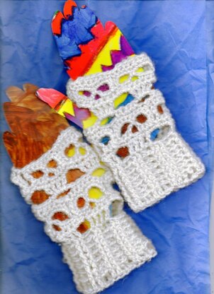 Fingerless gloves in an alternating pattern with post crochet cuffs. Written in American Crochet terminology. There are pictures of every row. Small/Medium measures 7 inches around by 5 1/2 inches long. Large measures 8 inches by 6 1/2 inches long. The thumb holes are formed in the pattern. Made up with one skein of sport or DK weight yarn. Gauge: Small and Medium sizes. 1 skull measures 1 1/2 inches by 1 1/2 inches made with a size 7 or g hook. The H hook is used for the large size. The skulls measure 1 3/4 inches by 1 3/4 inches. The smaller hook is used for both sizes in the rib. Please contact me for additional information, and for any help you may need with the pattern.
