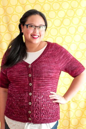 CRESTLINE is a pretty cardigan with short sleeves, twisted ribbing, and ribbon lace. I designed this sweater to wear on vacation in Vancouver, BC, and it was perfect over dresses and tees every day! The smooth hand- dyed yarn is worked at a slightly open gauge, and is lightweight but still warm and comfortable. Great for ocean breezes and office air-conditioning.