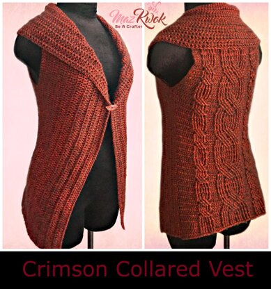 Women collared vest pattern - made by cable stitches, crimson color yarn, comfy and chic style.