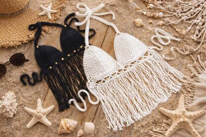 I have designed this easy beaded crochet tassel bikini halter top pattern with basic crochet stitches using US terminology of chains, single crochet and half double crochets so it is not complicated but still has an overall affect of looking fabulous. For UK crocheters there is a stitch conversion for you. This gorgeous original handmade design crochet cotton tassel halter bralette top will look great on the beach, at your next festival or just a top you can throw on and wear every day. This pattern has instructions for 3 basic ladies sizes of small (size: 6-8) with an approximate cup size of A-B, medium (size: 10-12) with an approximate cup size of C-D and large (size: 14-16) with an approximate cup size of D-DD. There is some flexibility with these sizes as the top will stretch and move with you. To see the sizing measurements, please refer to the image gallery above. The straps tie and will fit any size. I have made this halter bikini top in a 10 ply cotton yarn.