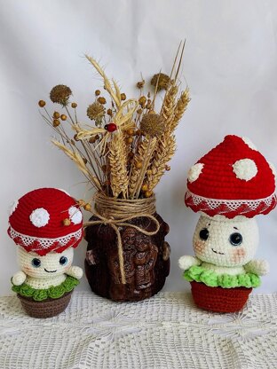 With this pattern you can knit two sizes of amigurumi mushroom - 14 cm (5.5 inches) and 19 cm (7.5 inches).