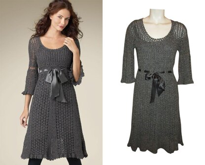 Gray crocheted dress with ribbon looped waist, flare sleeves 3/4 length, scalloped style edges. This dress is classy. Suitable for any season.
