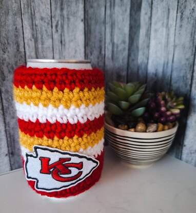 These are instructions for crocheting a very simple and easy project for your summer fun. It's a "pop cozy" which fits most pop or other type of beverages of choice. Using only single crochet stitches and a slip stitch, this is truly a beginner project or for more advanced. I made this particular one in the colors of the Chief's team, but you can alternate and use whatever colors you like best. The amount of yarn was hard to calculate because it takes only a small portion of each color (red), (gold), (white) skeins. Have fun crocheting this, it makes really nice gifts for family and friends, especially football fans. Logo is optional. Finished size is 4" x 4.5"