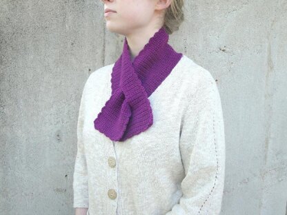 A keyhole keeps this simple crochet scarf in place, scallops add charm, and a sport weight yarn keeps it light and comfortable.