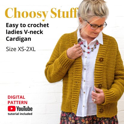 This is a beginner friendly classic crochet cardigan. In fact I call it my 'Old School Cardigan for grown ups', Nothing fancy just a plain cardi. My patterns have loads of photos and diagrams and there is also a You Tube video that will take you every step of the way, its impossible to make a mistake or not to understand the pattern.