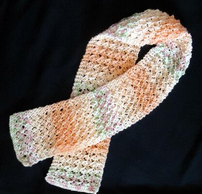 This is a delicate, light weight scarf to be worn all year round. Pretty to wear as an accent piece. Make these in many colors to mix and match your wardrobe. By changing needle sizes, it creates a more lacey look. Ours uses US # 10 and # 11. Fast and easy to knit!