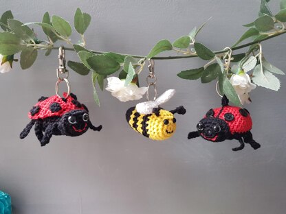 This is a pattern to make 3 mini beast keyrings - a bee, a ladybird with closed wings, a ladybird with open wings.