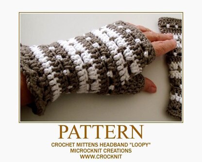Two (2) patterns - distinctive fingerless mittens and headband/neckwarmer. Fun and young at heart, create this "eye-catching" look with this simple pattern. Crochet in the round, no seams to sew. Wear the mittens on either hand. Pattern is the same for both left and right mittens.