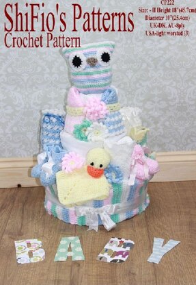 Includes pattern for - the nappy cake, toy owl, bib, bonnet, 2 bottle covers, duck sooky, bootees, burp cloth, headband, flowers perfect for a baby shower :)
