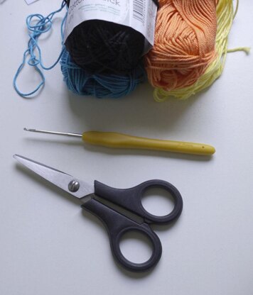 Light (US) / Light Worsted (UK) / 125m~50g (EU) Wool in each 1x blue, orange, yellow, a little bit black e.g. gründl Cotton Quick uni or GB Wool Carina