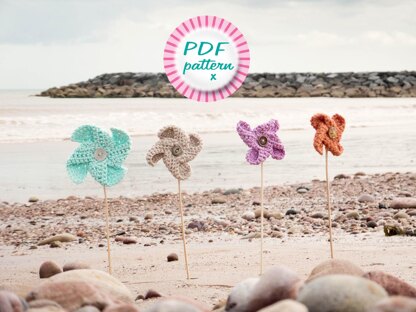 Crochet pattern for a pinwheel on a stick. Quick colourful gift and great stashbuster – use any yarn!