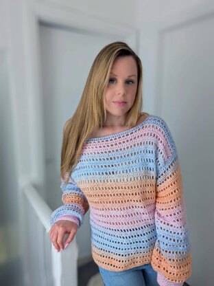 This crochet pattern features sizes S to XXXL (all the sizes/measurements are available in the pattern). This crochet sweater is made with Loops And Threads Soft Ombre yarn; this yarn can be substituted easily with any DK/light 3 yarn of your preference.