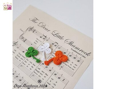 Crocheted shamrock in the color of the Irish flag. Modern crochet pattern . A detailed pattern for all crochet motifs - a graphic diagram, a photo and a verbal description of each crochet row. Design work by Starostina Olga. PDF file for 13 pages