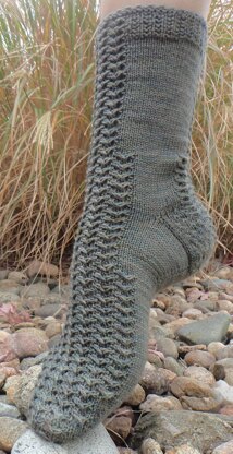 A fun, crocodile textured sock, formed with slipped stitches and lace and inspired by the poem in Alice in Wonderland.